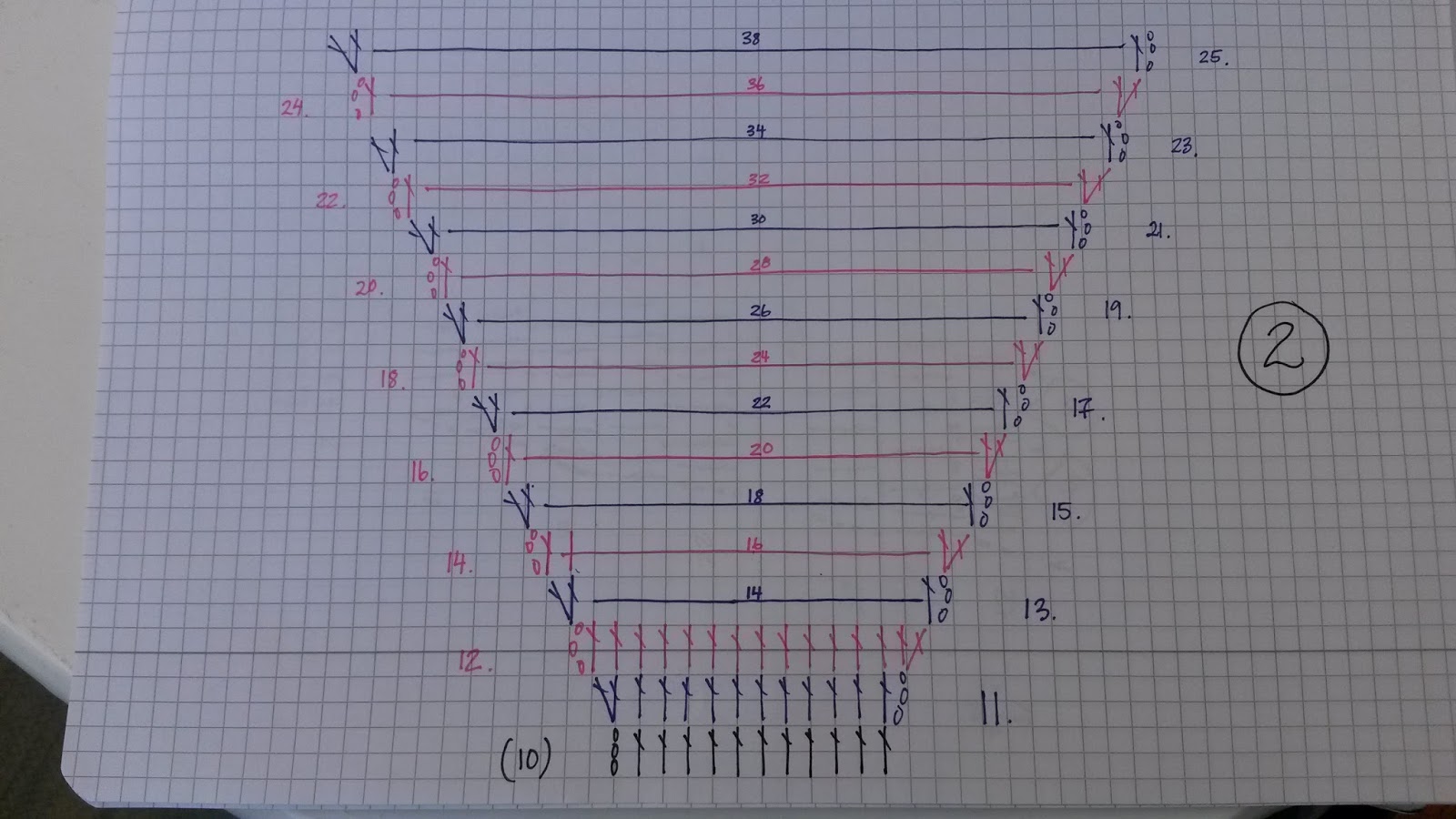 12: 2 st i första maskan, 1 stolpe i varje maska
